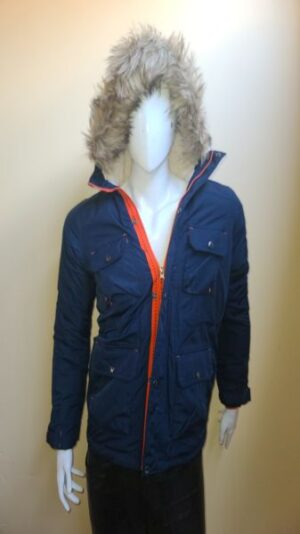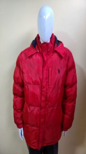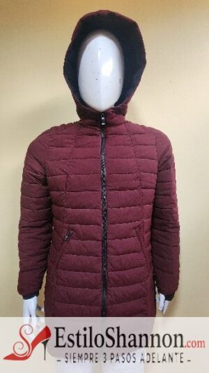 Chamarra impermeable con capuchaa desmontable, cuello cadete, cierre de apertura, 2 bolsillos latrales, un bolsillo interno, relleno de pluma y fibra.