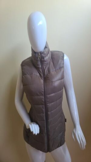 Chaleco cuello camisa biselado, cierre de apertura, dos bolsillos laterales, un bolsillo interno, relleno de fibra, producto delgado