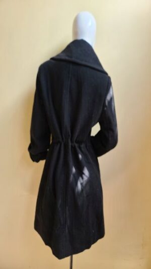 Saco con solapa manga larga, detalles de botones, dos bolsillos laterales, cinturon de ajuste en cintura.