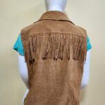 Chaleco cuello camisa, estilo texano con flecos en pecho y espalda, cierre de apertura, dos bolsillos laterales.