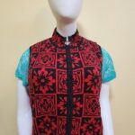 Chaleco cuello V, apertura con botones, detalle de piedras alrededor del cuello, bordado de flor en pecho
