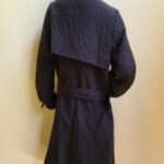 Saco largo con solapa, manga larga, cinturon de ajuste, diseños romboidales, puños rectos.