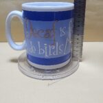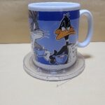 Taza Blanca con azul y con figuras de Bugs Bunny y Pato Lucas y texto en Ingles (café descafeinado es para los pajaritos)
