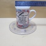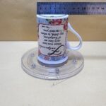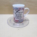 Taza Blanca con fondo de rosas y un mensaje en ingles que dice Fotprints