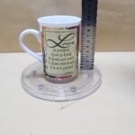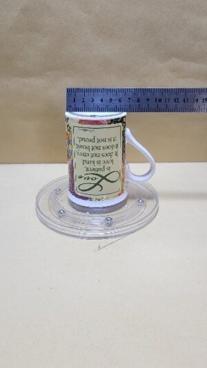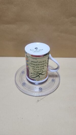 Taza Blanca con fondo de flores y un mensaje en ingles que dice Love
