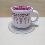 Taza Blanca semi tazon con fondo Rojo y figuras de copos de nieve en Blanco, afuera figuras repetidas tipo colgantes en Rojo