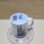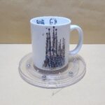 Taza Blanca Hermosa con la iglesia de la Sagrada Familia en Barcelona España y texto en ingles indicando lo mismo un sello dentro la taza tambien con la cara de Gaudi