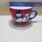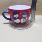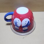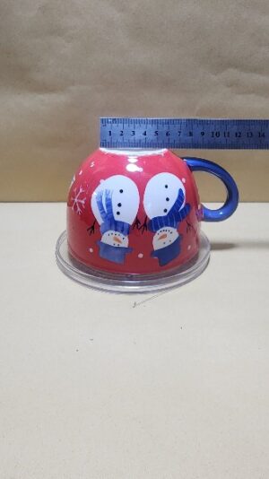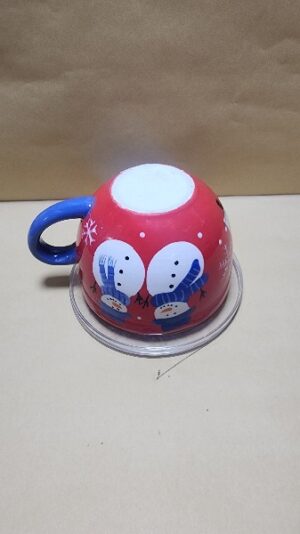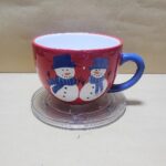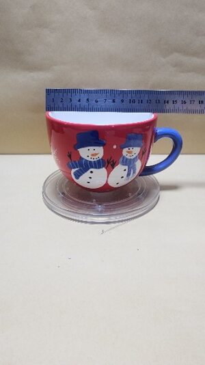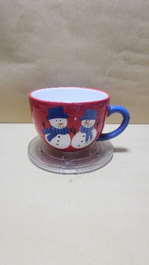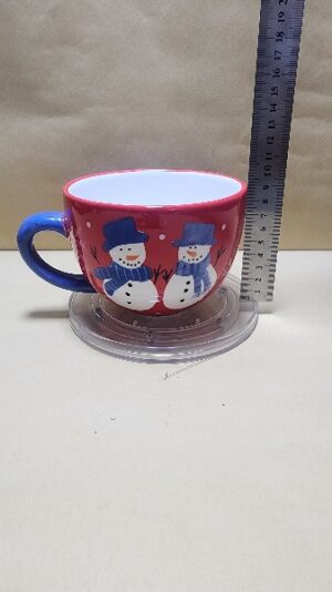 Taza Roja con agarrador Azul y fondo Blanco tipo tazon con impresion de 2 muñecos de nieve y un pino verde