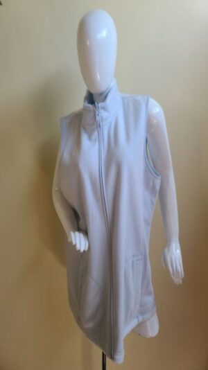Chaleco cuello cadete, cierre de apertura, dos bolsillos laterales, cola de pato