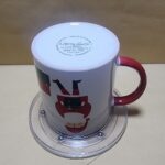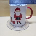 Taza Blanca con motivos de navidad un papanuel con regalos en el piso y agarrador Rojo, dentro tiene texto en Ingles (Barry esta frio afuera)