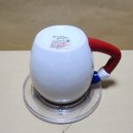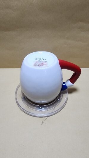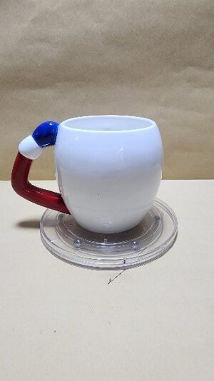 Taza Blanca tipo tazon con forma y cara de Papanuel el agarrador es el brazo con manga Roja y guante Azul