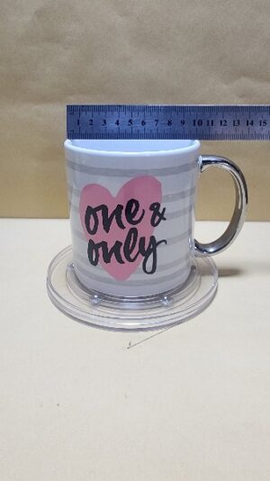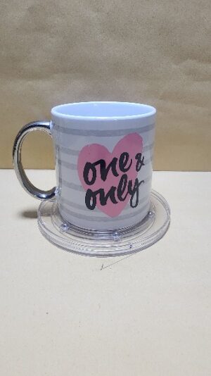 Taza Blanca con agarrador Cromado impreso con un corazon Rosado y texto en ingles (el Unico)