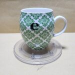 Taza Blanca elegante con forma semi obalada con impresion de formas verdes tipo ceramica y la letra E pequeña