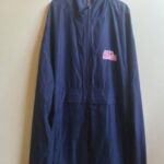 Chamarra impermeable con cierre de apertura, bolsillos laterales, puño recto con broches.