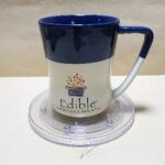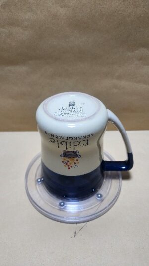 Taza Crema y Azul con el logo de Edible (compania que hace arreglos tipo florables pero con frutas)