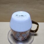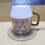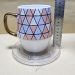 Taza Blanca Hermosa forma estetica moderna con rombos Rosa Celeste con lineas en Oro y agarrador en Oro