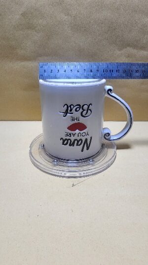 Taza Blanca elegante con fondo Rojo y texto en Ingles (Abuela tu eres la mejor ) y un beso rojo