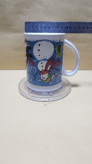 Taza Blanca con impresion de Movitos navideños y figuras de hombre de nieve, pinguino, reno y papanuel