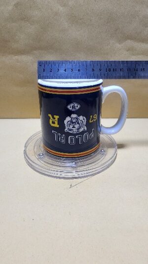 Taza Blanca con impresion de franja Azul y un tigre que representa en terto en Ingles ( Polo Ralf Louren)