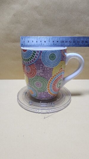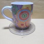 Taza Blanca semi ovalada con arte tipo jipy flores abstractas todo al rededor