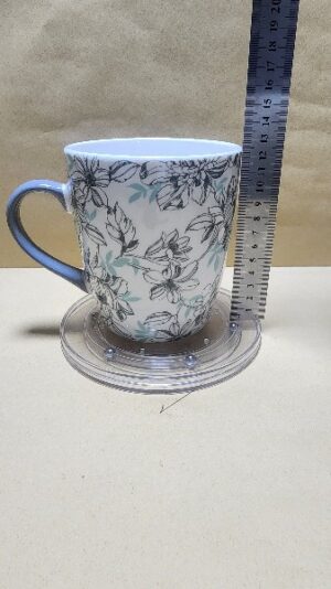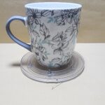 Taza Blanca con agarrador Celeste Gris, con impresion de Flores y Hojas plomas y un texto en Ingles (no renuncies a tu sueño diario)
