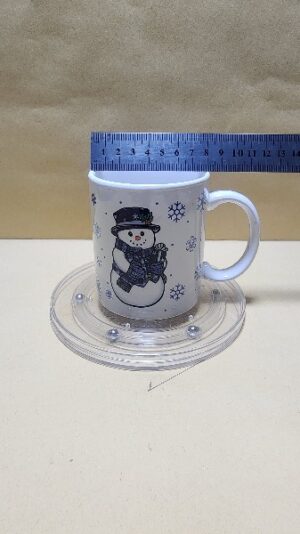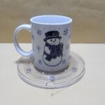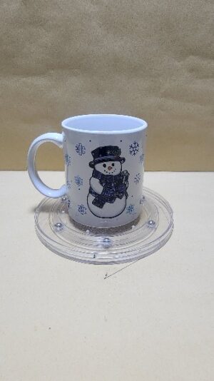 Taza Blanca con figuras celestes de copos de nieve y un hombre de nieve hermoso