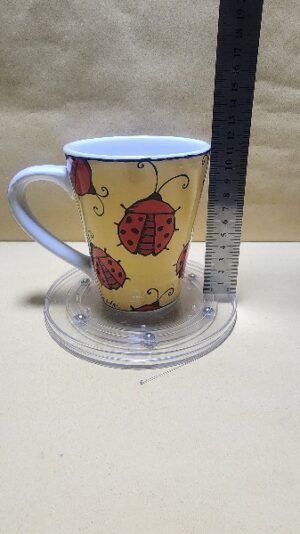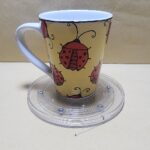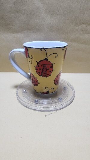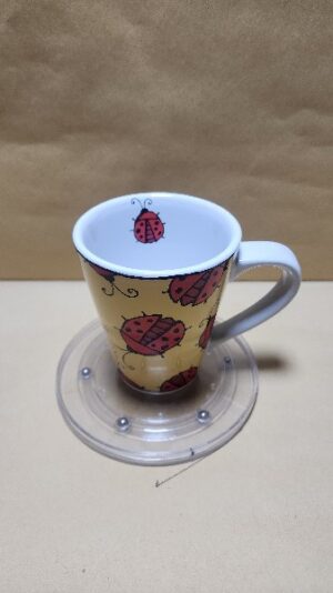 Taza Blanca tipo cono con Franja Amarilla y dibujos de Mariquitas adentro tambien hay una