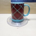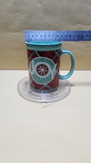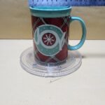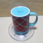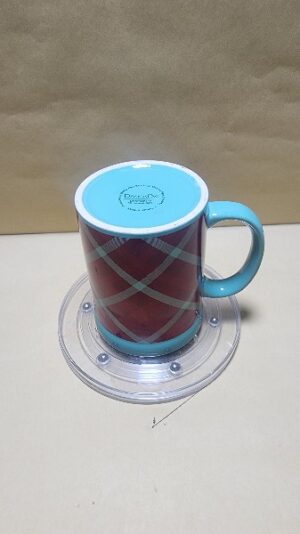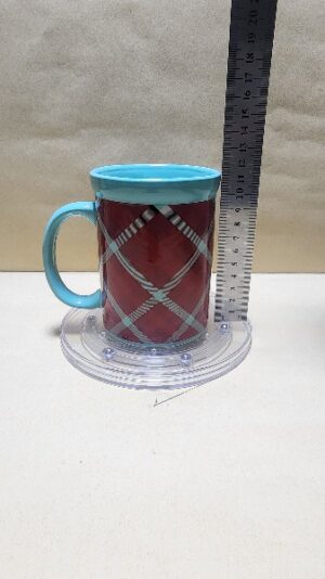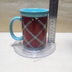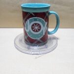 Taza Celeste Verde con franja roja a rombos y un sello en Ingless (alegria)