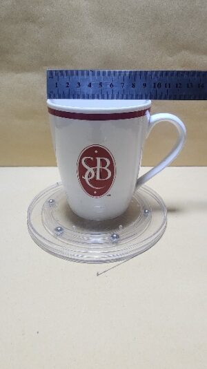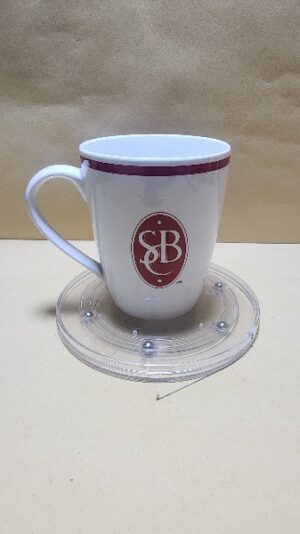 Taza Blanca Hermosa semi larga con el Borde Rojo y un sello con las letras SBC