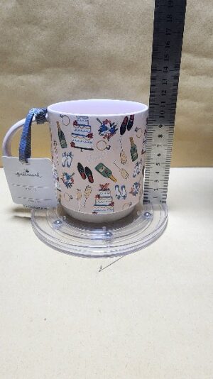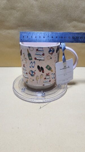 Taza Rosada con muchas figuras de una selebracion de matrimonio