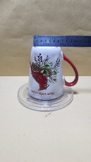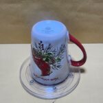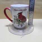 Taza Blanca con borde y agarrador Rojo, impresion en alto relieve del pajaro Cardinal de USA y texto en Ingles (deseos calurosos de Navidad)