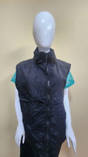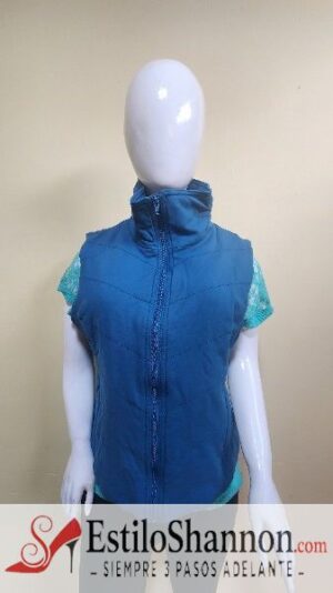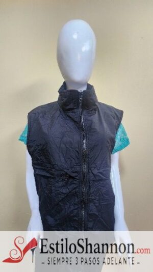 Chaleco cuello cadete, tipo impermeable, cierre de apertura, dos bolsillos laterales con cierre, tela interior frizada. Liga de expansión en cintura