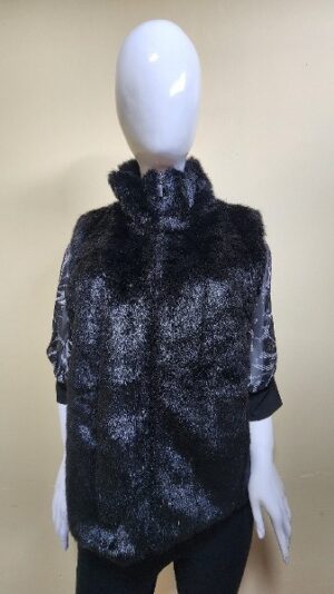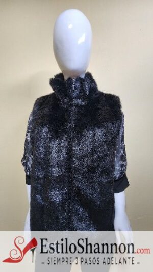 Chaleco cuello cadete, exterior afelpado, cierre de apertura, dos bolsillos laterales.