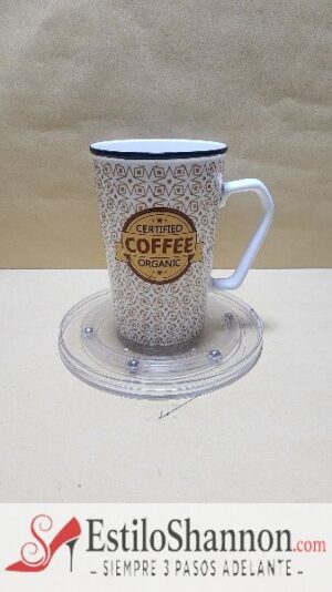Taza Blanca Alta con figurines de estrellas y un sello con texto en Ingles ( Certificado café organico)