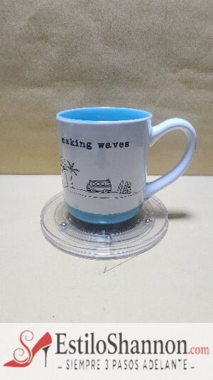 Taza Blanca con fondo y base pintada de Celeste dibujado un paisaje de la Playa y texto en Ingles ( Haciendo Olas)
