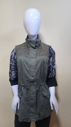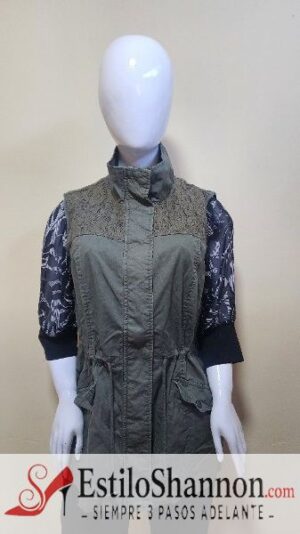 Chaleco cuello cadete, cierre de apertura con procteccion de broche, dos bolsillos laterales, detalle de tela bordada en hombros
