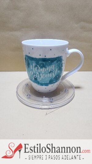 Taza Blanca con impresion verde y texto en Ingles ( buen dia hermoso(a)