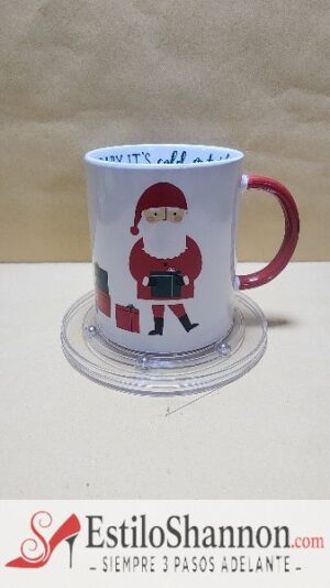 Taza Blanca con motivos de navidad un papanuel con regalos en el piso y agarrador Rojo, dentro tiene texto en Ingles (Barry esta frio afuera)