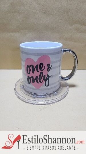 Taza Blanca con agarrador Cromado impreso con un corazon Rosado y texto en ingles (el Unico)