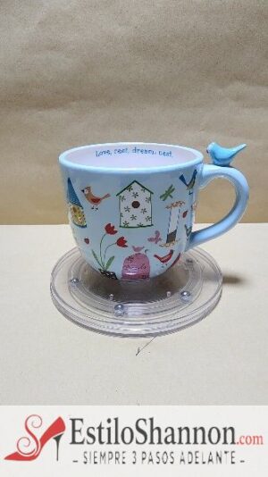 Taza Blanca semi tazon Pintada toda de Celeste con dibujos de casitas y pajaritos, un pajarito en 3d ensima del agarrador adentro texto en Ingles ( ama, descansa, sueña, descansa)