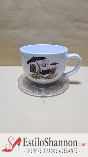 Taza Blanca tipo tazon con impresion de un Panadero en bicicleta y su paraguas