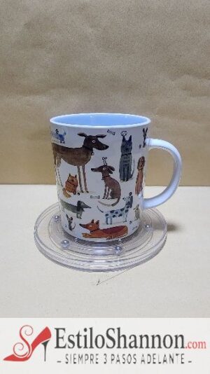 Taza Blanca y Alta con impresion de diferentes perros con el fondo Celeste